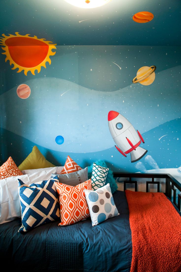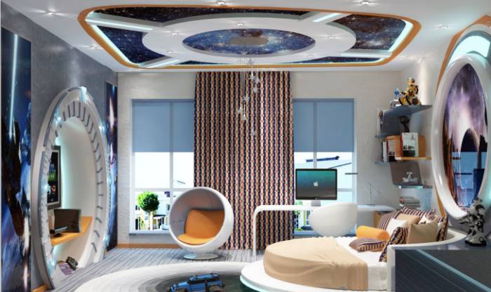 Космос в детской порадует юного исследователя. Для стен можно подобрать тематические обои или украсить их соответствующими постерами. «Космический» пол можно украсить ковром-паззлом или напольным покрытием стального оттенка. Обязательный элемент «космической» комнаты – это звездный потолок. Добиться такого эффекта можно тремя способами: