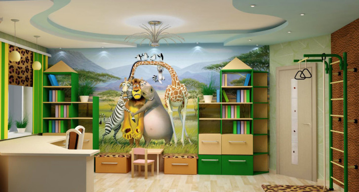 Другой способ отделки – выделить одну из стен яркими обоями с рисунком. При этом оригинально смотрятся обои, переходящие со стены на потолок. Три другие стены можно оклеить в спокойные однотонные цвета. Также можно выделить не всю стену, а только ее часть, воспользовавшись фотообоями (смотрите фото).