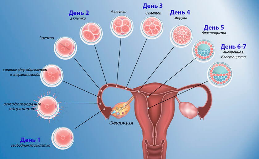 Беременность начинается с момента слияния гамет в фаллопиевой трубе. Из двух половых клеток образуется одна клетка нового живого организма – зигота. Уже через 26–30 часов она начинает дробиться, и к 5 суткам беременности количество клеток составляет несколько десятков. На этом этапе зародыш находится в стадии бластоцисты.