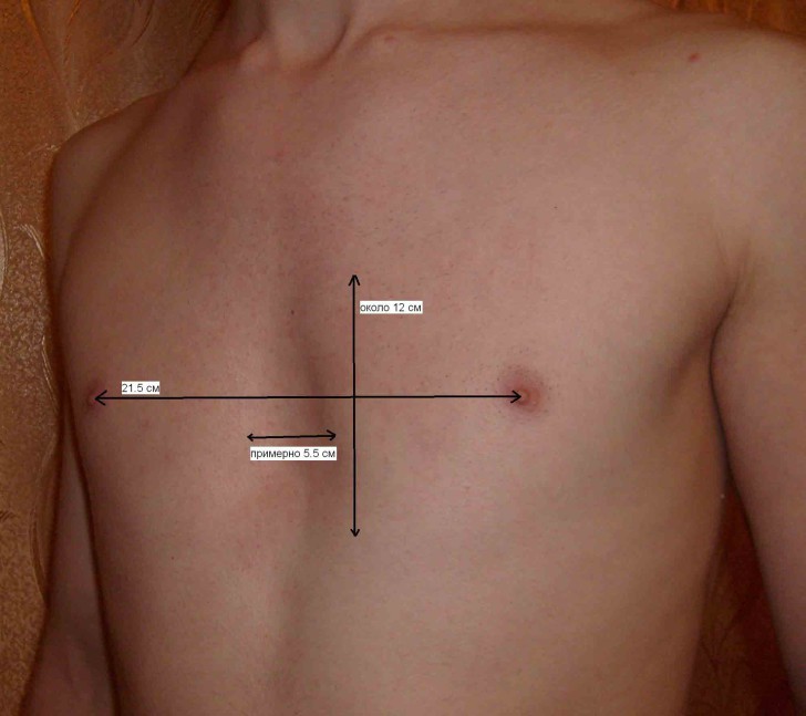Опытный специалист визуально заметит отклонения в формировании грудной клетки, оценив симметричность, форму и размеры грудины. При прослушивании сердечного ритма и легких у пациента с деформацией ГК слышны хрипы, шумы в сердце и тахикардия.