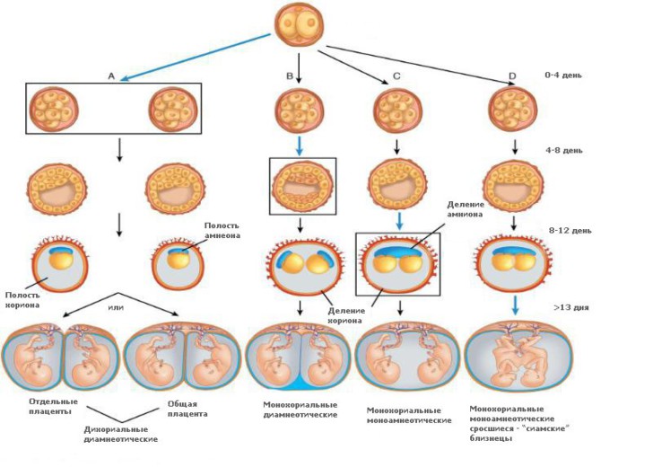 Гинекологи различают 2 вида двоен – монозиготные и дизиготные двойни. Монозиготную двойню обычно называют близнецами. Они формируются в одной яйцеклетке. В зависимости от срока разделения зиготы специалисты различают следующие ее разновидности: