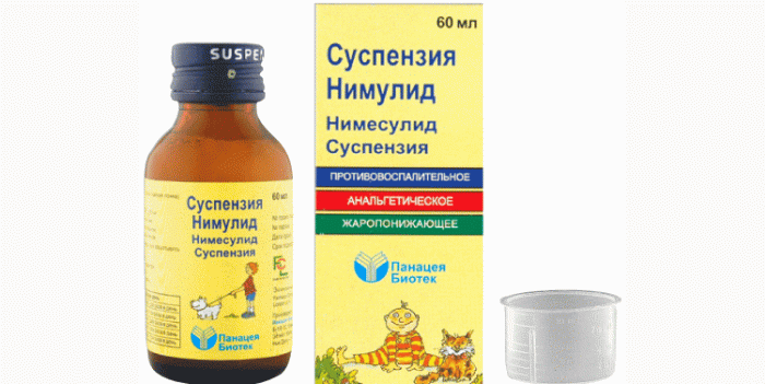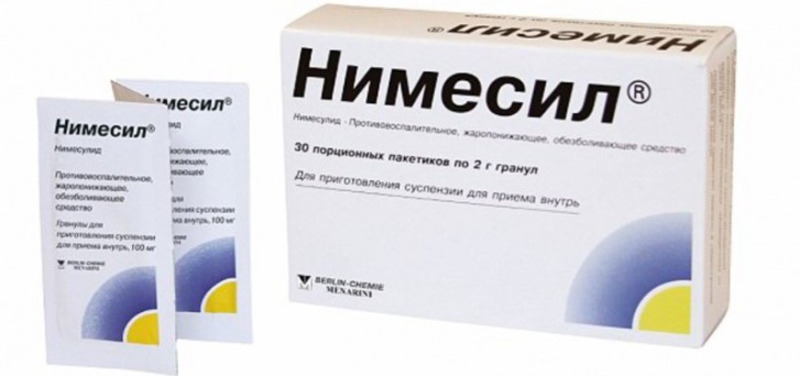- Нимесил. Выпускается в порошкообразной форме, из которого готовят раствор. Нимесил останавливает воспаление и сбивает температуру.